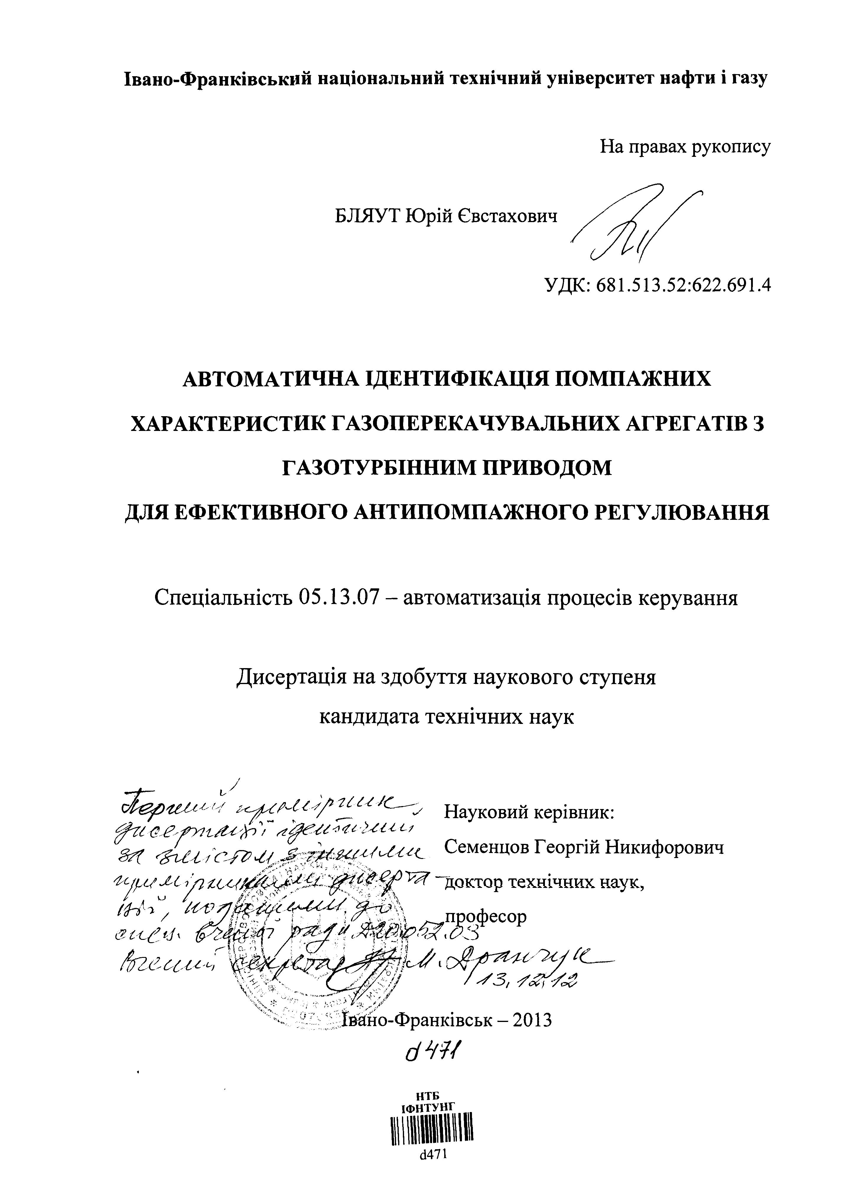 Автоматична ідентифікація помпажних характеристик газоперекачувальних агрегатів з газотурбінним приводом для ефективного антипомпажного регулювання : дис. ... канд. техн. наук : спец. 05.13.07 "Автоматизація процесів керування" : Дата захисту 19.04.13 / Ю. Є. Бляут. - Івано-Франківськ, 2013. - 218 с. : рис., табл. - 173-186.