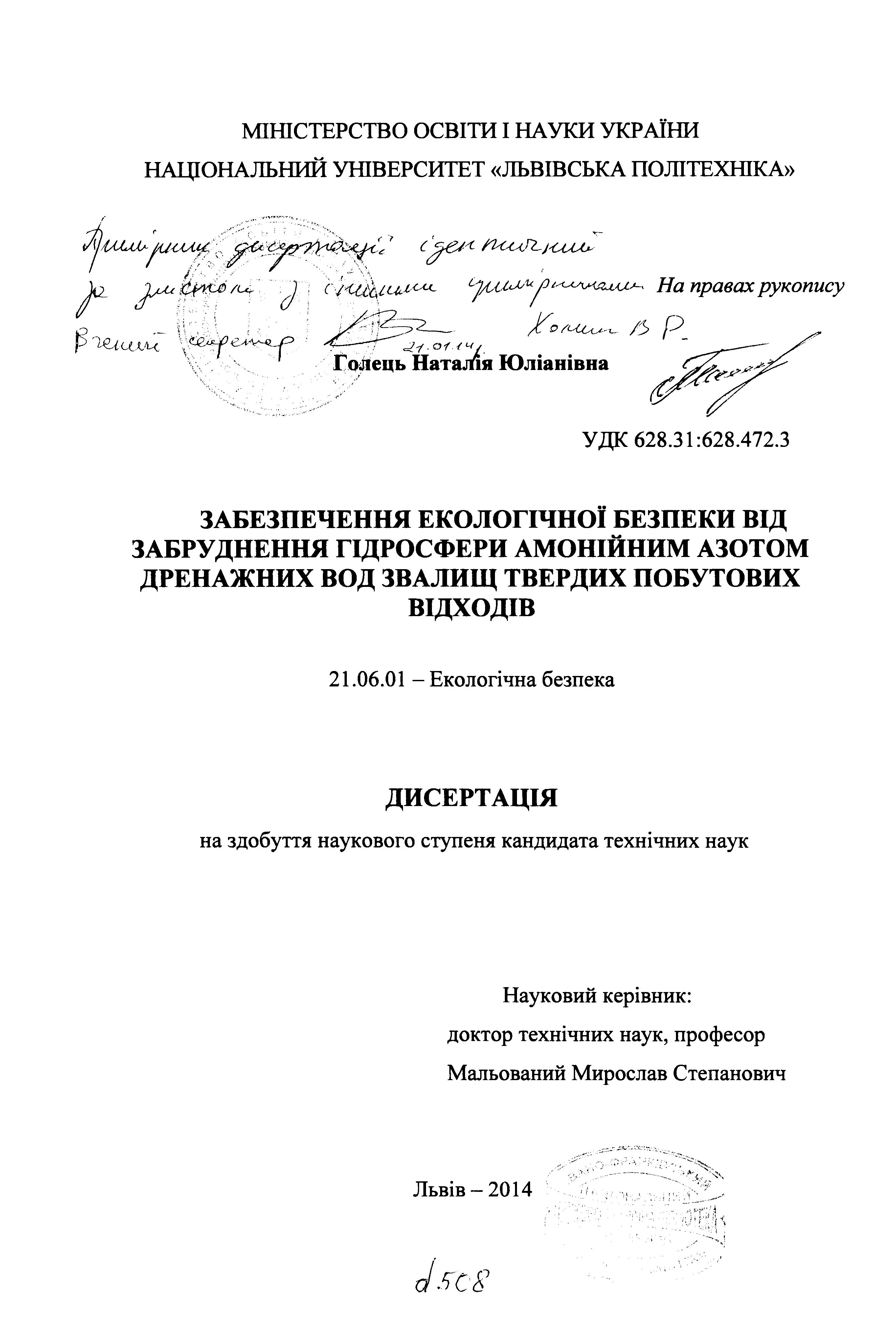 Забезпечення екологічної безпеки від забруднення гідросфери амонійним азотом дренажних вод звалищ твердих побутових відходів : дис. ... канд. техн. наук : спец. 21.06.01 "Екологічна безпека" : Дата захисту 22.05.14 / Н. Ю. Голець. - Львів, 2014. - 130 с. : іл., рис. - 118-130.