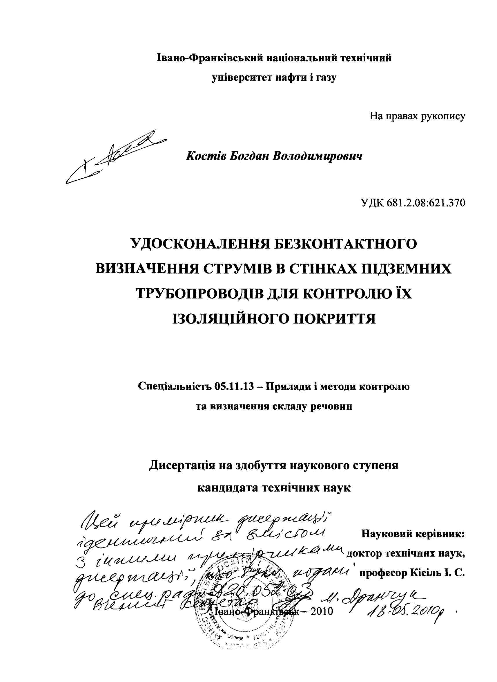 Удосконалення безконтактного визначення струмів в стінках підземних трубопроводів для контролю їх ізоляційного покриття : дис. ... канд. техн. наук : спец. 05.11.13 "Прилади і методи контролю та визначення складу речовин" : Дата захисту 18.06.10 / Б. В. Костів. - Івано-Франківськ, 2010. - 246 с. - 152-160.