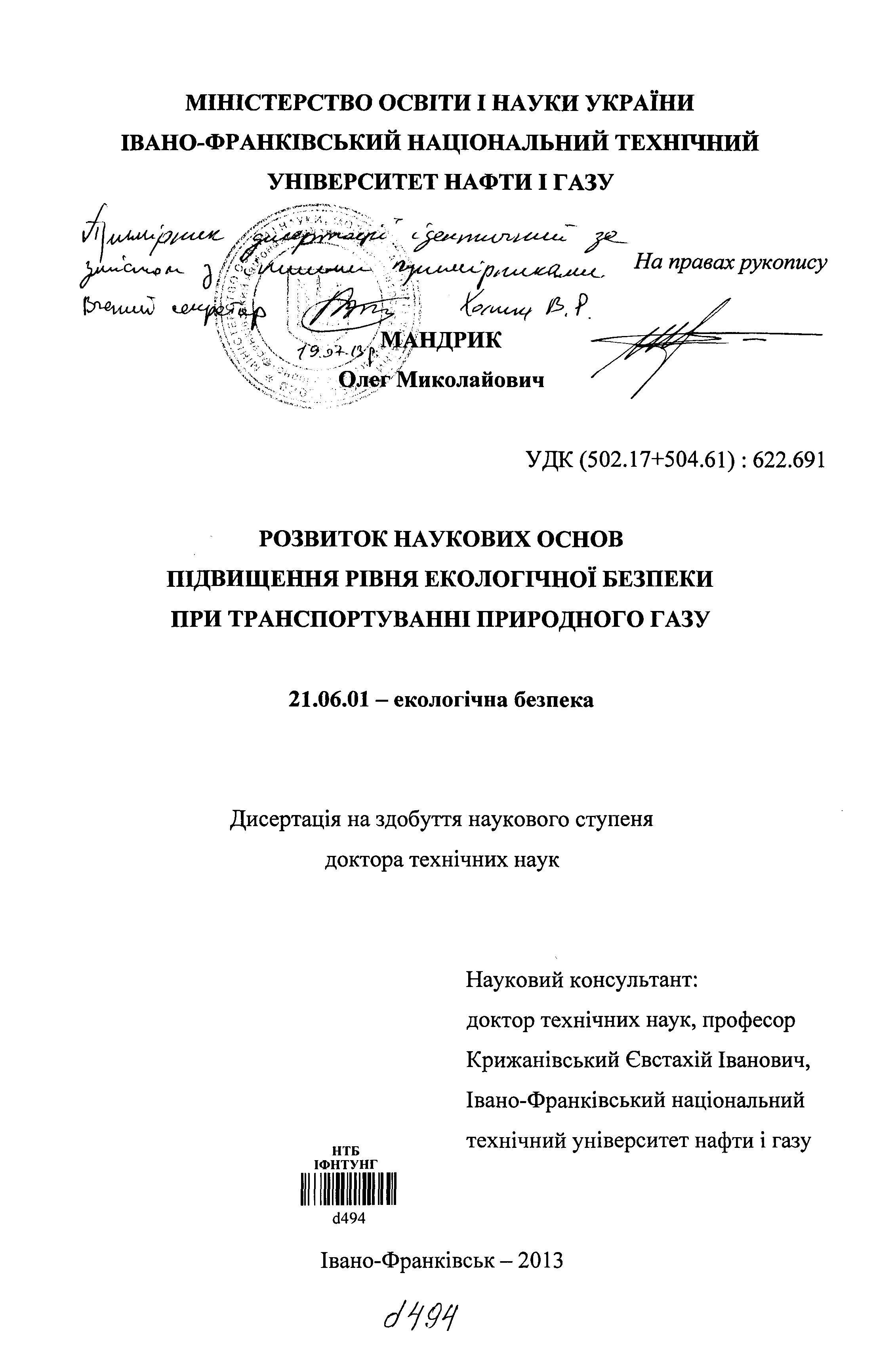 Розвиток наукових основ підвищення рівня екологічної безпеки при транспортуванні природного газу : дис. ... д-ра техн. наук : спец. 21.06.01 "Екологічна безпека" : Дата захисту 31.10.13 / О. М. Мандрик. - Івано-Франківськ, 2013. - 336 с. : іл., рис., табл. - 283-318.