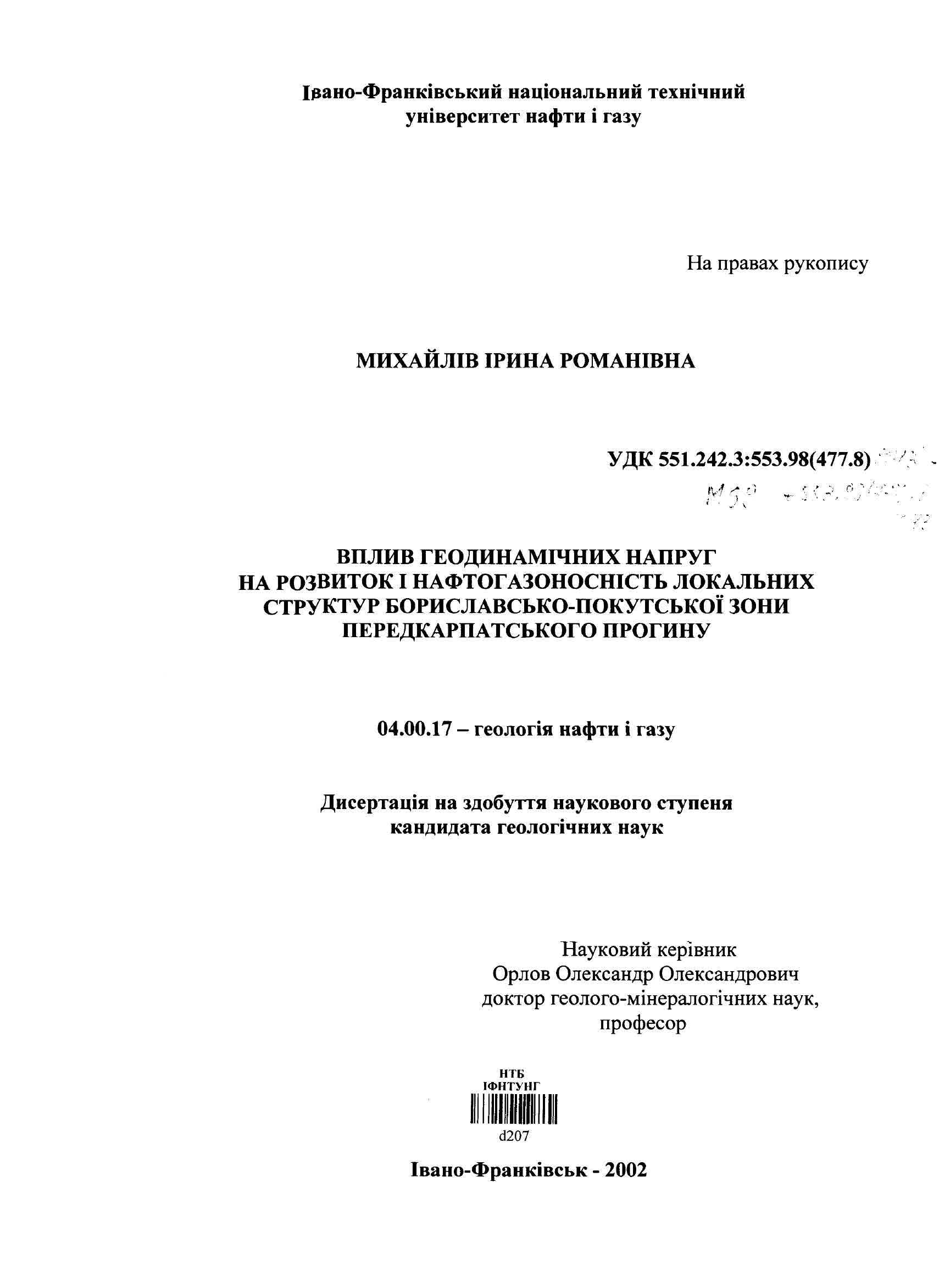 Вплив геодинамічних напруг на розвиток і нафтогазоносність локальних структур Бориславсько-Покутської зони передкарпатського прогину : дис. ... канд. геол. наук : спец. 04.00.17 "Геологія нафти і газу" : Дата захисту 28.02.03 / І. Р. Михайлів. - Івано-Франківськ, 2002. - 166 с. - 152-166.