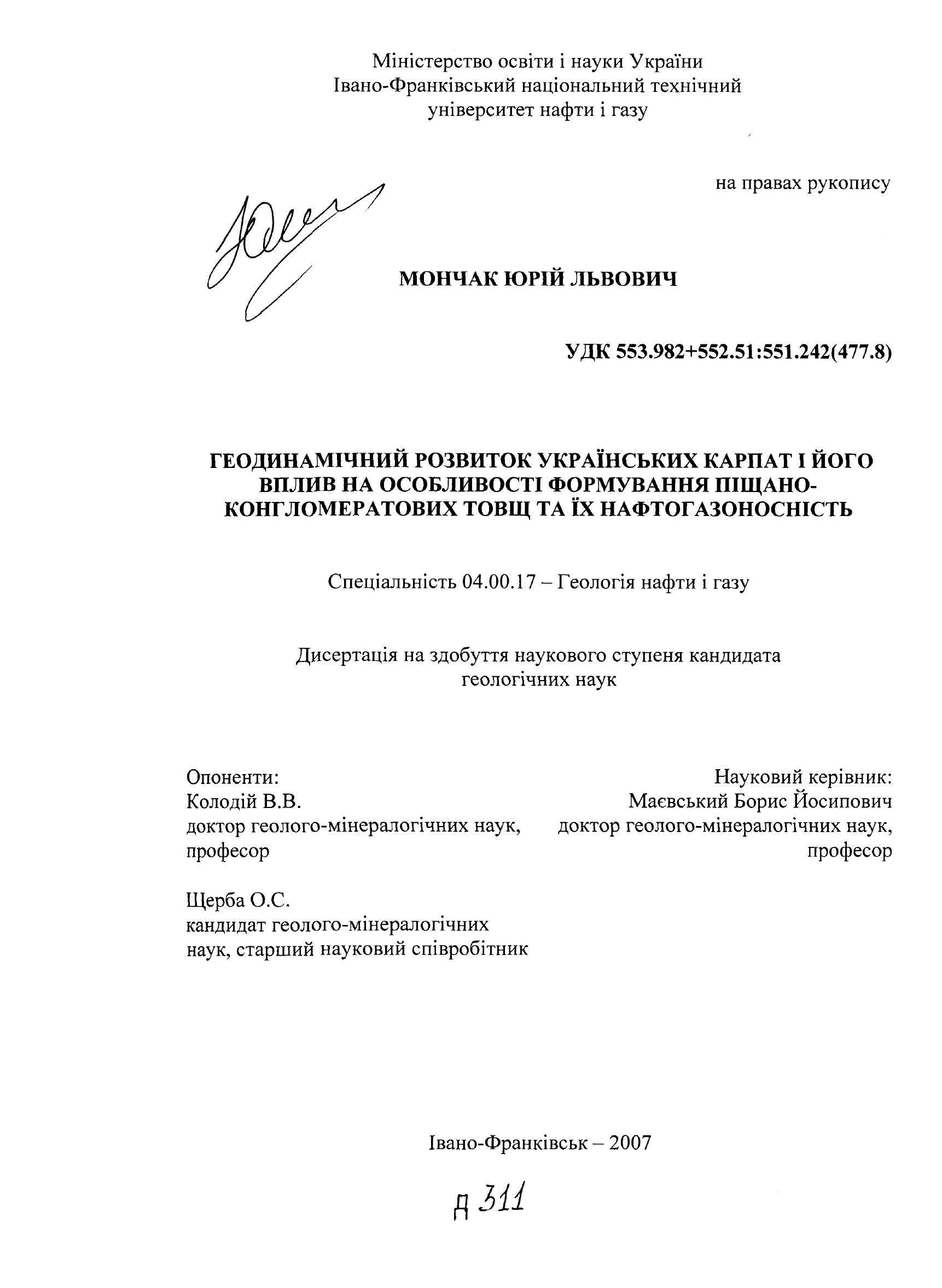 Геодинамічний розвиток Українських Карпат і його вплив на особливості формування піщано-конгломератових товщ та їх нафтогазоносність : дис. ... канд. геол. наук : спец. 04.00.17 "Геологія нафти і газу" : Дата захисту 02.11.07 / Ю. Л. Мончак. - Івано-Франківськ, 2007. - 150 с. - 134-191.